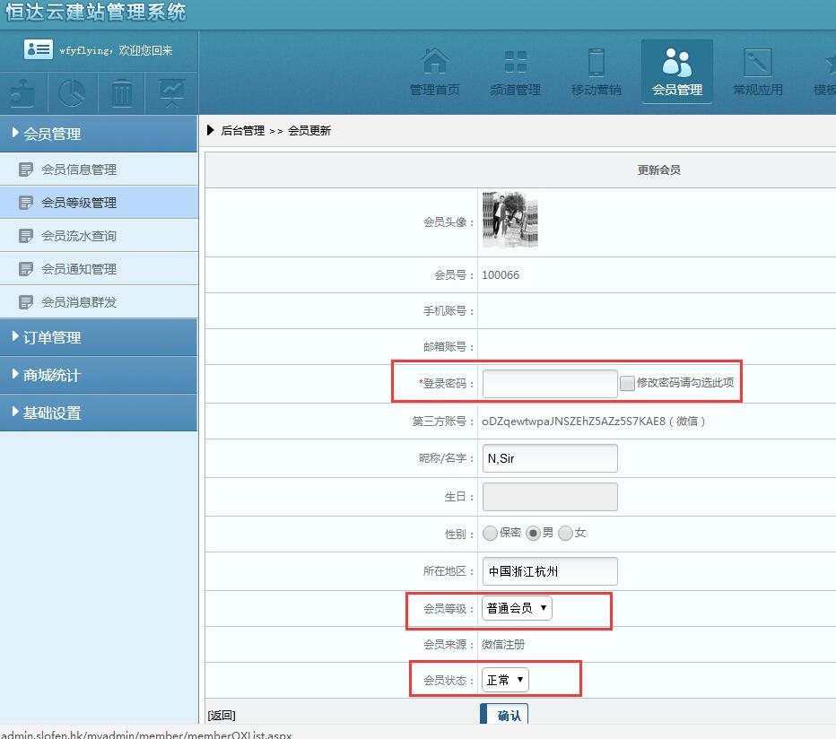 可以点击编辑为会员修改密码、修改会员等级、修改会员状态等操作