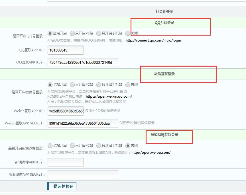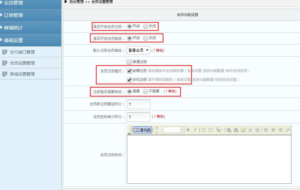 [会员设置管理]:可设置会员的功能设置,也可设置关联QQ、微信、新浪微博来登录。