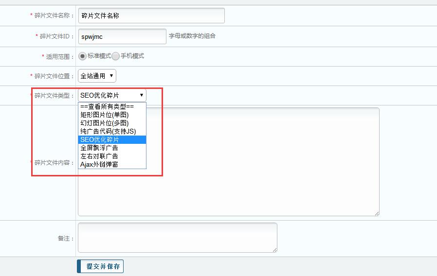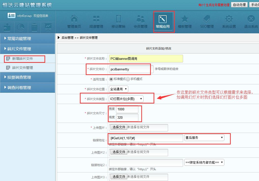 首先,新增一个碎片文件,【常规管理】——【碎片文件管理】——【新增碎片文件】,然后填写完相应参数即可