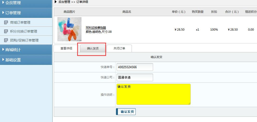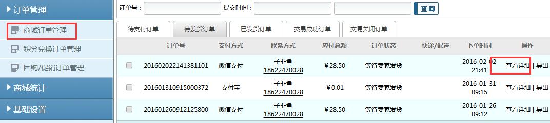 [商城订单管理]:可查看商城所有交易订单,包括待支付、待发货、已发货、交易成功、和交易关闭订单,并进行下一步操作。