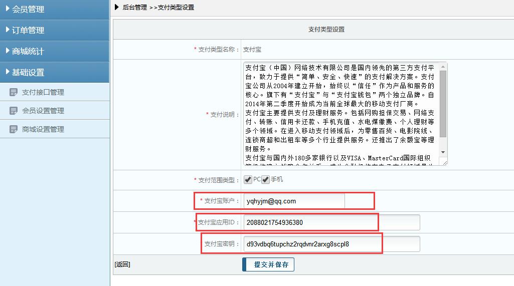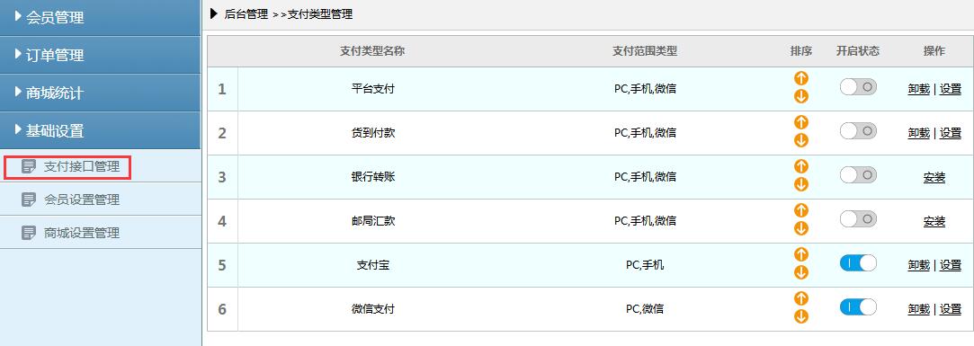 [支付接口设置]:可以安装设置以下支付接口,并为其绑定相应帐号和所需密钥。