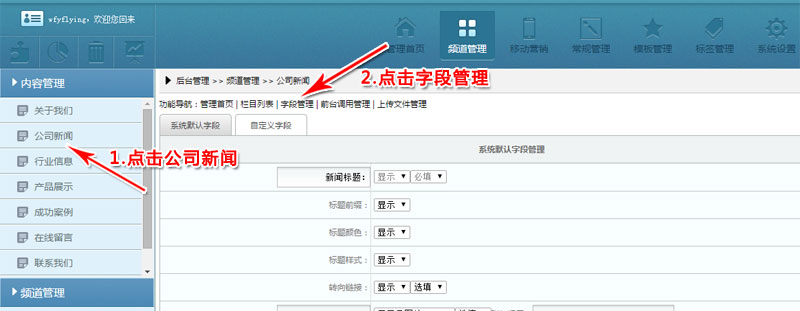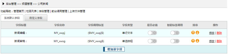 综合列表型频道的字段管理通常分为系统默认字段以及自定义字段,如下图所示:
