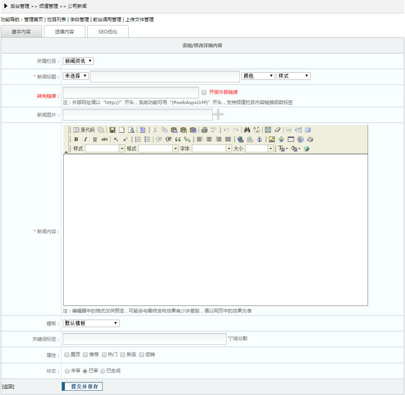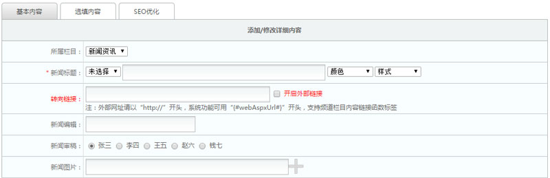 1.系统默认字段:通过设置系统默认字段,可以控制综合列表型频道的加内容添表单,如修改表单的标题说明文字,显示和隐藏部分表单等,使综合列表型频道的内容添加表单更有灵活性和定制性。如下图所示中的新闻标题、新闻图片、新闻内容都可以改名和设定是否隐藏以及是否必填: