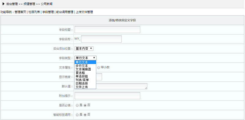 2.自定义字段:如果系统默认字段无法满足频道的内容展示需求,可以通过自定义字段添加新的字段,自定义字段可以支持单行文本、多行文本、文本编辑器、复选框、单选按钮、列表/菜单、日期选择、文件上传等八种字段类型,如下图所示:
