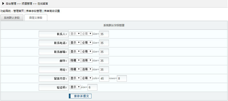 自定义表单型频道的字段管理也分为系统默认字段和自定义字段,但它与综合列表型频道有所区别,如下图所示: