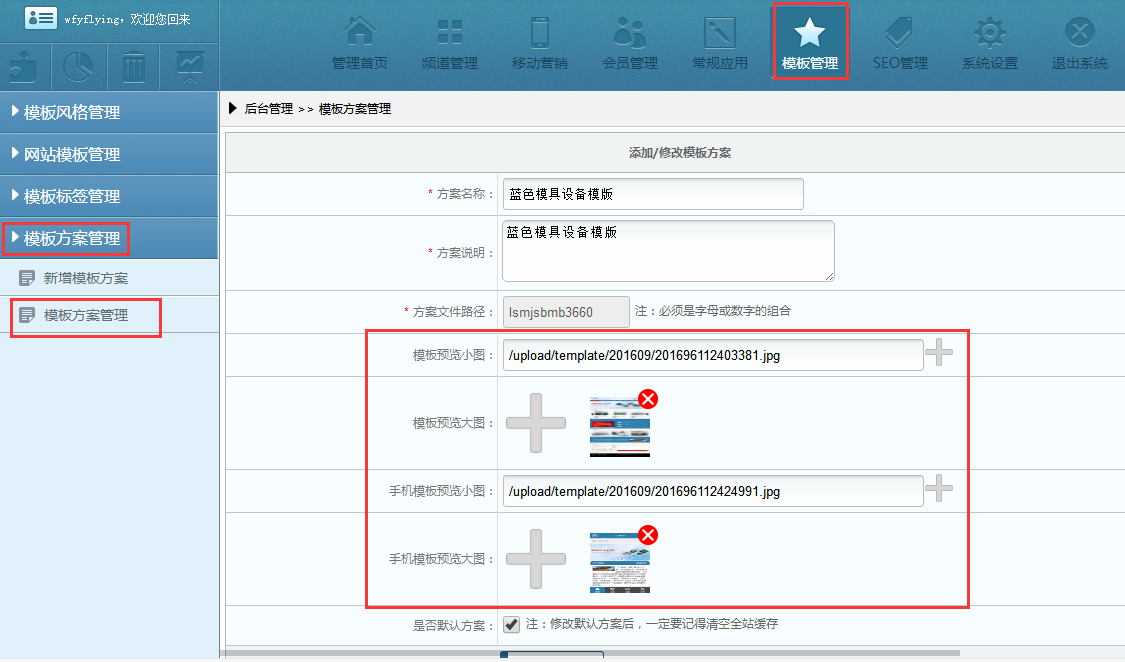上传模版预览图,在【模版管理】——【模版方案管理】——【模版方案管理】——【查看修改】——上传模版预览小图和手机模版预览小图和大图