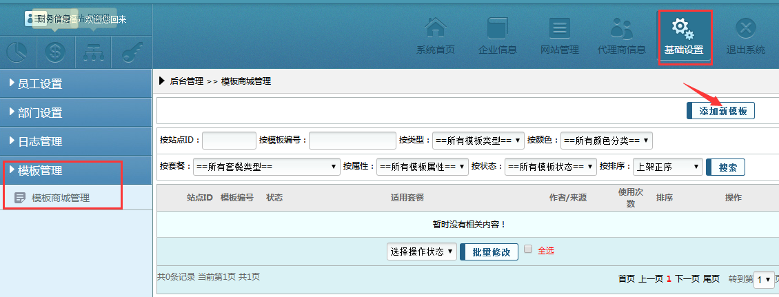 2. 上传完之后提交并保存,回到代理商平台,【基础设置】——【模版管理】——【模版商城管理】——【添加新模版】