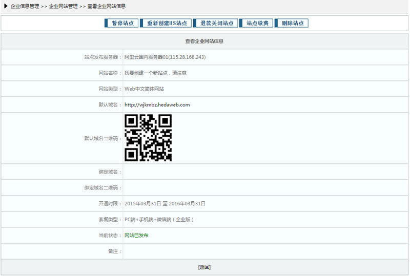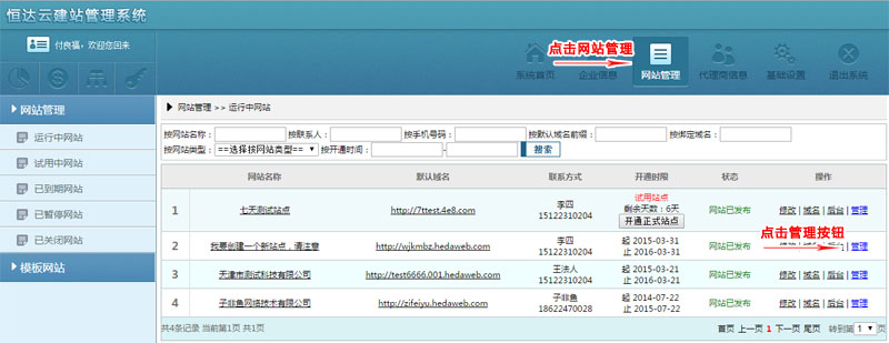 代理商为终端客户开通的站点,要根据需要,可以进行暂停站点、重新建站IIS站点、退款关闭站点、站点续费、删除站点等操作,操作流程如下,点击头部导航的网站管理,然后在显示的网站列表中找到要操作的站点,再点击后台的【管理】按钮,如下图所示: