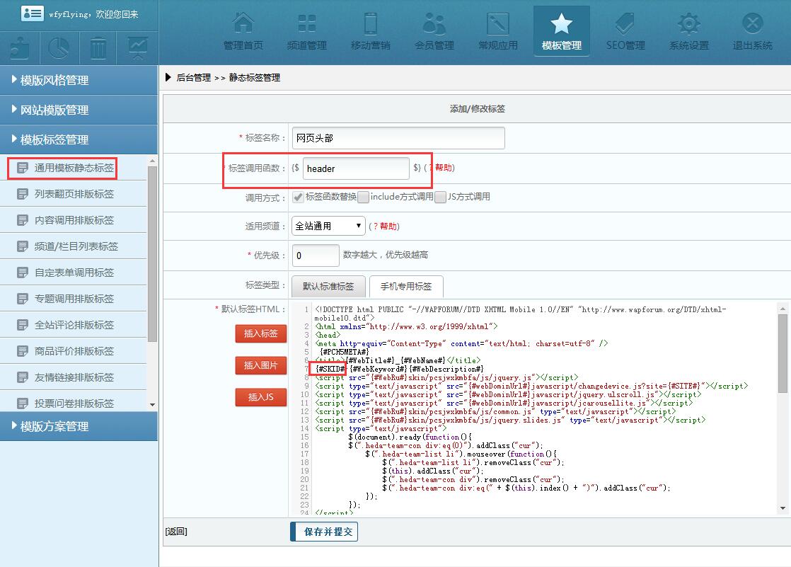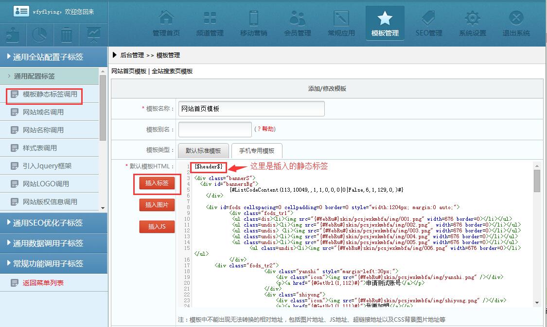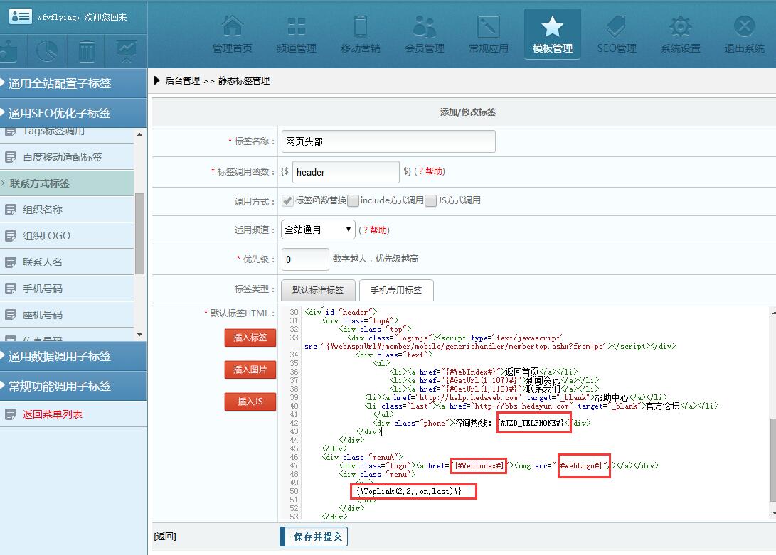 如下图所示,静态标签内一般插入的是标准的HTML代码,如示例中是制作一个网站头部静态标签: