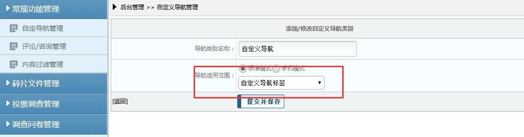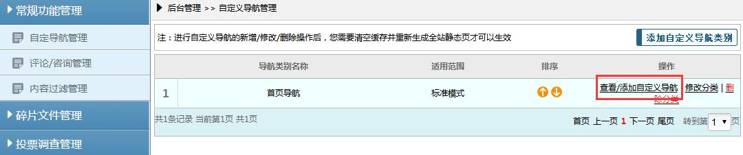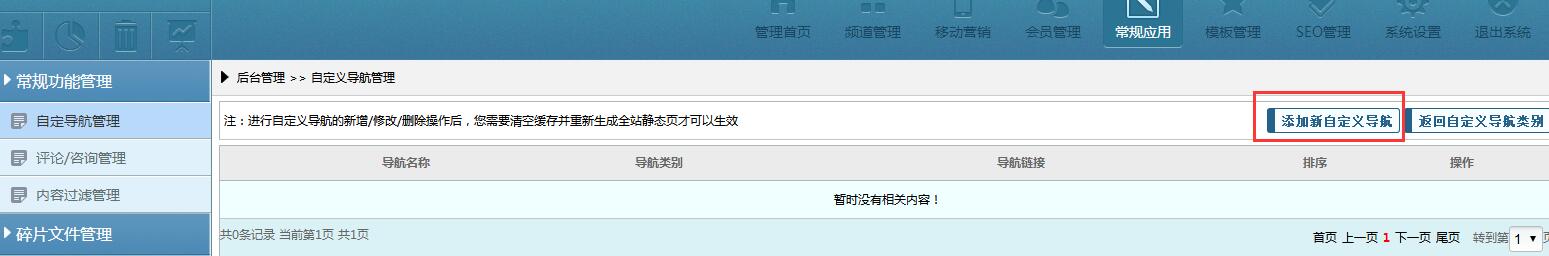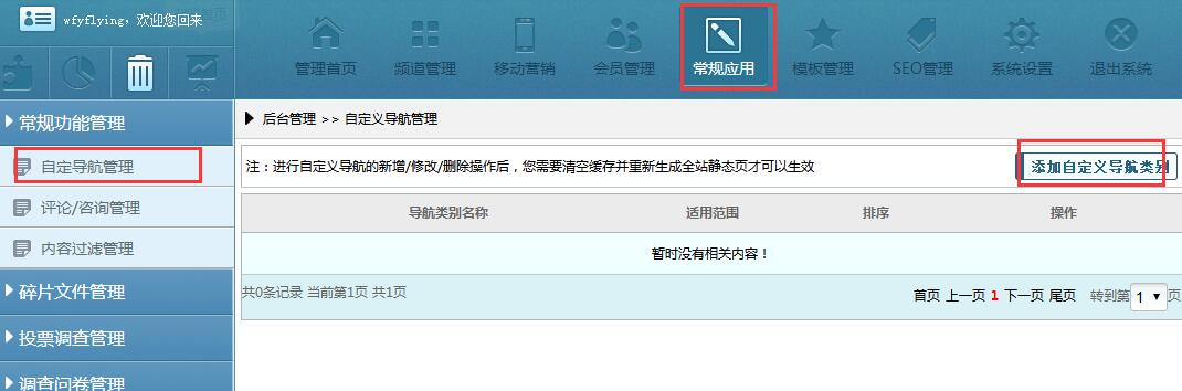 首先添加导航类别,【常规应用】——【常规功能管理】——【自定导航管理】——【添加自定义导航类别】