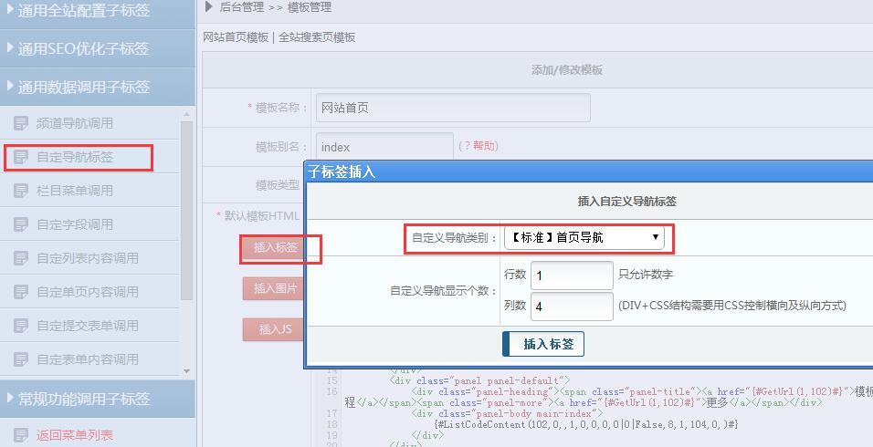 然后回到需要调用自定义导航分类的模版位置,【插入标签】——【自定导航标签】