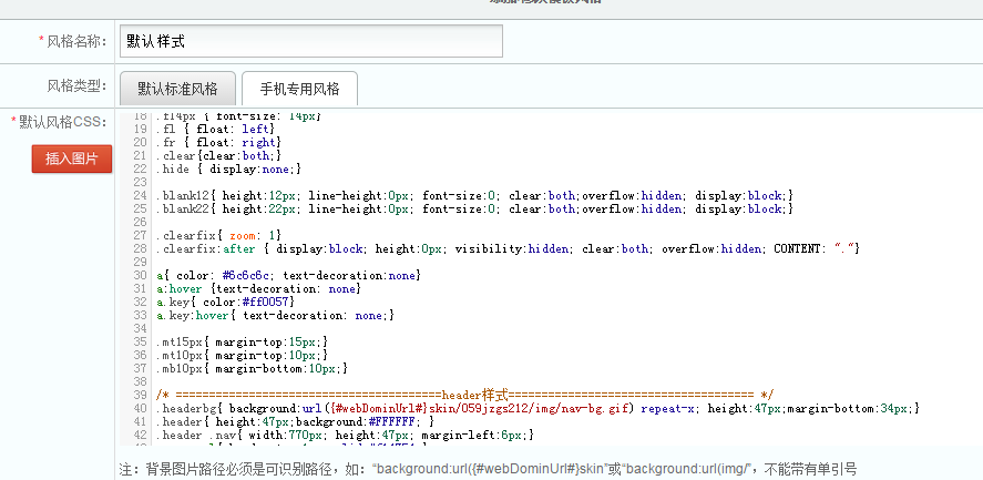 小技巧:一个网站并非一定只用一个CSS样式,也可以有多个CSS样式,如首页用一个(默认情况下,首页会调用优先级最高的CSS样式。通过【频道管理】【网站基本设置】,可以给首页绑定一个指定CSS样式),关于我们用一个,新闻中心用一个等等,相当于新增多个模板风格文件后,指定给不同频道来调用。为了方便管理,我们可以把这多个CSS样式相同的部分放到【系统自带CSS样式】中,如多个频道可能共用同一个头部导航,这样头部导航的样式可以放到【系统自带CSS样式】中,以后如果需要修改头部导航的CSS样式时,只需修改【系统自带CSS样式】中的CSS代码就可以了。