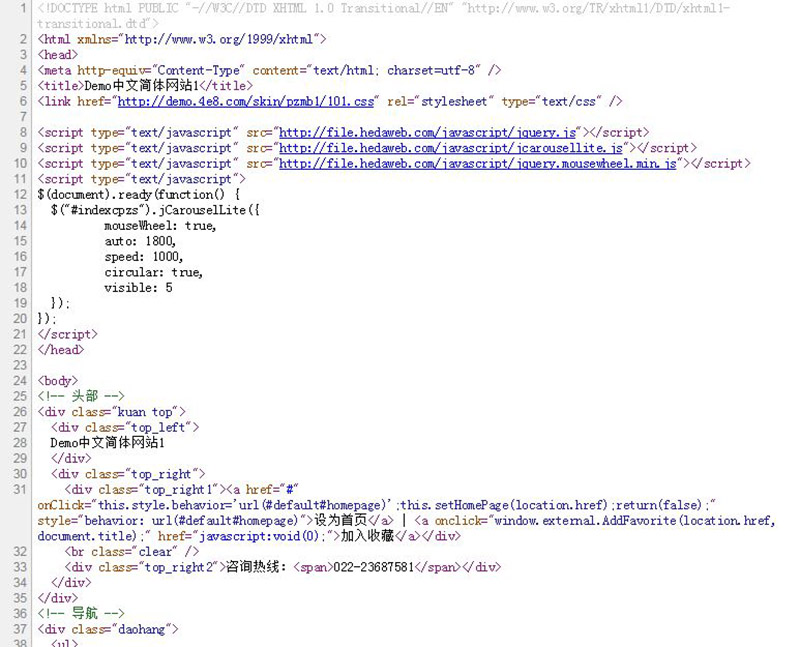 在这个页面中,我们可以看到,它可以分为头部导航部分,头部Banner幻灯片部分,中间内容区部分,底部网站联系和版权部分。通过这个首页,我们可以很清晰的了解这个企业网站是属于什么企业,有哪些频道,最近有哪些新闻动态,提供了哪些产品,地图位置是什么,联系方式是什么等。而要让后台方便的更新这些信息,就需要这个页面能和后台数据库很好的结合,实现相关数据的后台更新,以及前台动态调用。从下图我们可以看到这个首页的部分HTML源代码: