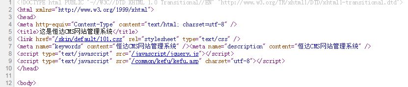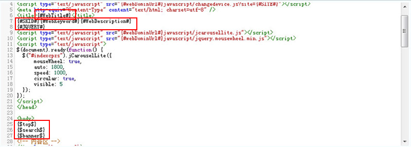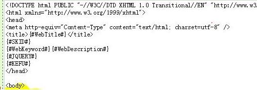 在<head>与</head>区域中,包含了<title><link><meta><script>等HTML代码,分别用于定义网站的名称,指定CSS的路径,设定用于SEO的关键词和描述,以及调用Javascript脚本执行一些特殊的页面效果。这些代码,我们可以通过插入标签的方式,用指定的子标签函数来替换这些内容,以实现首页模板的后台维护和前台的动态展示。比如,我们在【系统设置】【网站基本设置】中更改了网站title标题,那么因为我们在<title></title>中插入的中首页模板的制作(网站Title值调用)标签,在首页模板发布后会自动调用数据库中保存的【系统设置】【网站基本设置】里设置的内容替换首页模板的制作来进行显示,实际效果就会变成上面两张图片的对比效果。上面图片中的首页模板的制作代表网站Title值调用,代表样式表调用,代表网站关键词调用,代表网站描述调用,代表引入Jquery框架,{#KEFU#}代表在线客服调用(点此查看相关帮助:【什么是HTML子标签函数?】),诸如此类的HTML子标签函数还有很多,我们可以参赛过在模板添加/修改界面中点击【插入标签】来查看,可以说大部分HTML子标签函数我们可以从字面上就能了解其作用。