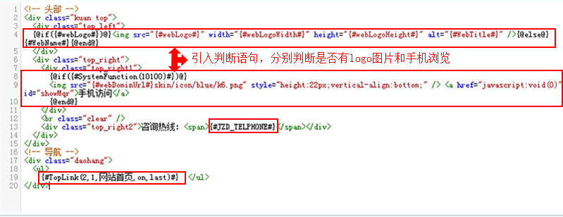 点击【模板管理】【全站模板管理】【首页/通用模板管理】【网站首页模板】,在添加或修改模板时,我们把切好的静态文件中的首页HMTL代码拷贝进去,同时,我们把首页头部的部分代码替换成黄色块选中部分静态标签函数,它包含了三个静态标签,分别是:“网站头部”,“网站搜索”,“网站Banner”。这三个静态标签可以通过点击【插入标签】【全站配置子标签】【自定义静态标签】直接插入到首页模板中,也可以通过【标签管理】【全站静态标签管理】复制【静态标签调用函数】并拷贝到首页模板中。如图所示,是“网站头部”代码在【全站静态标签管理】中的管理: