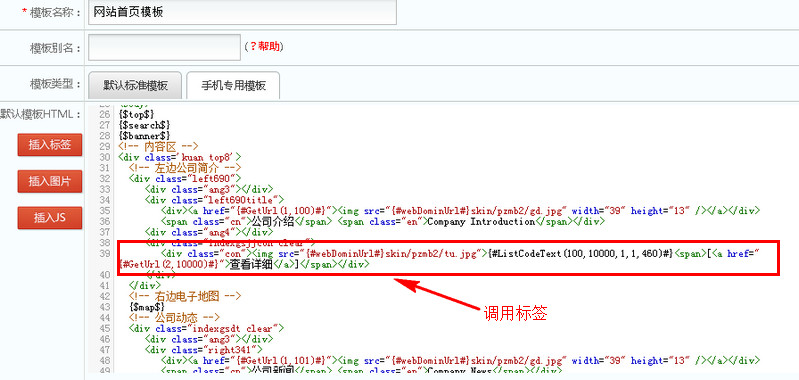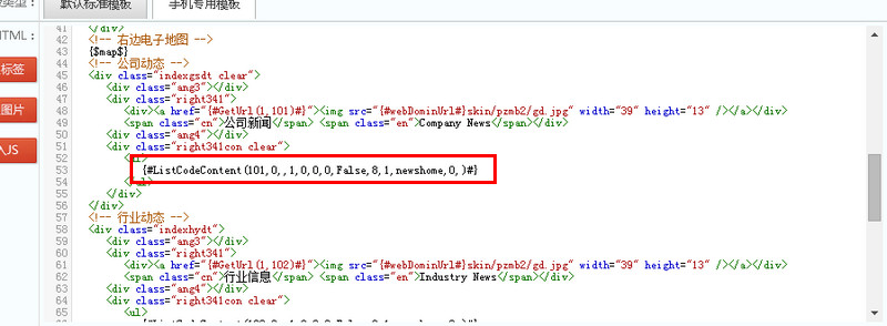 可以看到,“公司介绍”是需要调用网站频道中“关于我们”下属的“公司介绍”栏目的内容来展示的,电子地图是调用后台管理首页中“编辑基本联系方式”中的“地图位置”所标注的位置生成的静态地图图片文件,“公司新闻”是调用网站频道中“公司新闻”的最新8条内容,“行业信息”是调用网站频道中“行业信息”的最新8条内容,企业名片是调用后台管理首页中“编辑基本联系方式”中的相关内容,“产品展示”是调用网站频道“产品展示的”最新20条内容,这里面除了留言反馈图片是只需加个超链接的,其它都是需要从数据库中调用实时动态内容并显示的,需要实现这些动态内容的调用,我们同样需要用到HTML子标签函数。比如下图所示: