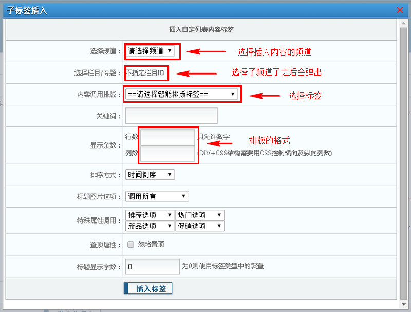 可以看到,红色框区块选中部分是一个HTML子函数:””,这是通过【插入标签】【通用数据调用子标签】【自定列表内容调用】来生成相应的子标签函数并插入到模板内容中鼠标选中的位置的。下面的行业动态,也是使用同样的方式进行操作的。这里,我们可以看看【自定列表内容调用】子标签函数的参数生成界面,如下图所示: