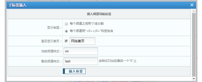 可以看见,有两种常见的显示类型:“每个频道之间用‘|’线分割”或“每个频道用'<li></li>'标签包含”。是否显示首页默认为显示,打了对勾;当前频道样式默认为on;最后频道样式默认为last;那么点击插入标签后两种显示类型分别为: