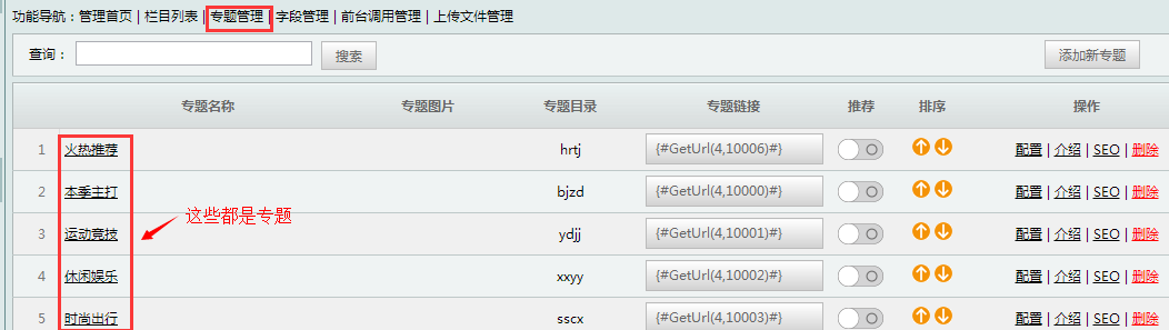 要有专题调用排版标签,首先得有专题,如下图所示:在某个频道中的功能导航中有专题管理这一项,这里可以添加专题