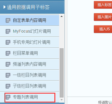 在频道或栏目页中调用专题,插入标签—通用数据调用子标签—最下面的专题列表调用。