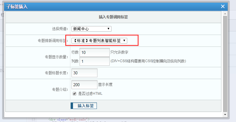然后就可以新增专题调用排版标签了,和其他新增标签一样,需要在【开始标记】、【主题循环】、【结束标记】输入内容,