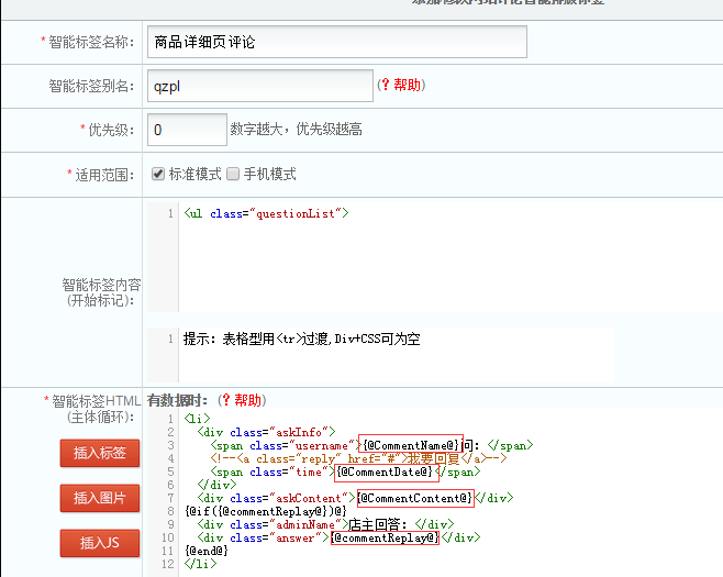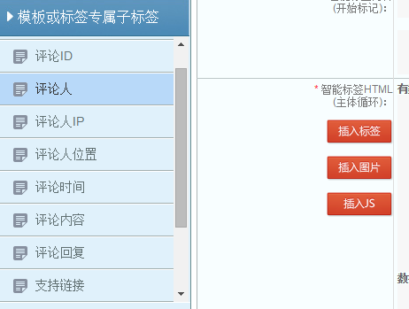 其用法和之前我们讲到的标签 一样,首先要新增一个网站评论智能标签,分别在标签的开始、主体、和结束处添加内容,主体为我们需要循环的评论内容,我们这里循环的是一个<li>标签,