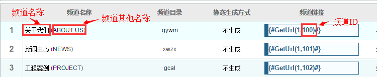 2. 频道ID({#channelid#})、频道名称({#channelName#})、频道其他名称({#channelEnName#}),分别是频道列表里配置当中的选项,直接插入标签即可。