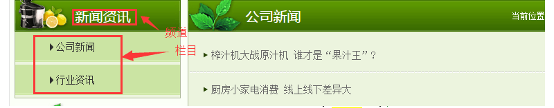 如图,当我们想要在页面的一侧显示该频道下的栏目时,就可以用【栏目菜单调用】标签。