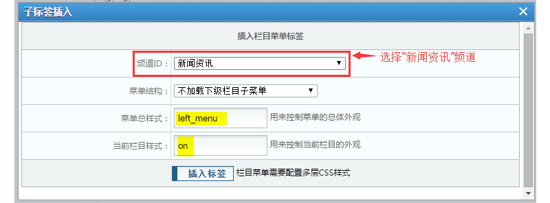 在模板页面中点击【插入标签】→找到【栏目菜单调用】标签点击,就会弹出下面的对话框: