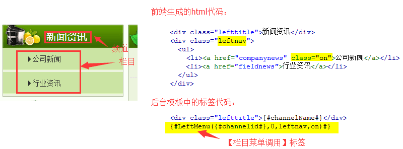【栏目菜单调用】标签可以调用指定频道下的栏目列表,要求格式比较固定,如:<div class="样式名称"><ul><li><a href="栏目链接">栏目名称</a></li></ul></div>。该标签属于带参数函数标签。
