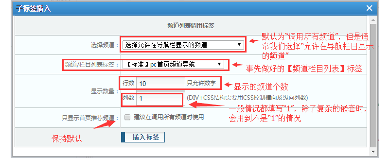 根据图片中的红色提示文字依次设置参数,然后点击最下方【插入标签】,即可生成【频道列表内容调用】标签
