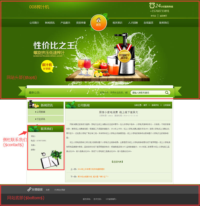 前面介绍了(综合列表型)的频道首页模板和栏目模板制作,这里接着讲(综合列表型)-内容页模板的制作,例子如下,当我们点击新闻资讯里任一条新闻时,页面会跳转到这条新闻的详细页面,这个详细页面就是我们要介绍的内容页模板: