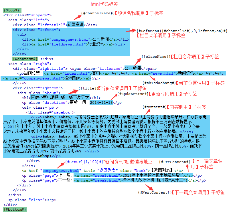 我们来看看html代码页面中其他需要替换成标签代码的部分,下图中我们做了非常清晰的对比: