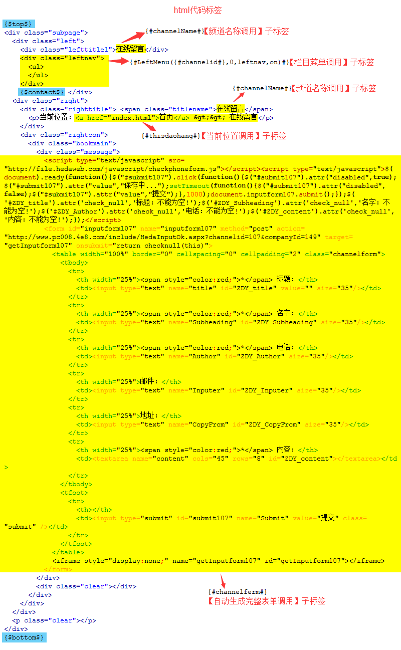 表单提交页模板的制作,关键在于如何插入自定义表单,我们可以使用【自动生成完整表单】标签:{#channelform#},该标签可以直接帮我生成整个完整表单,然后我们使用表单默认绑定的样式“channelform”来进行表单样式的控制。